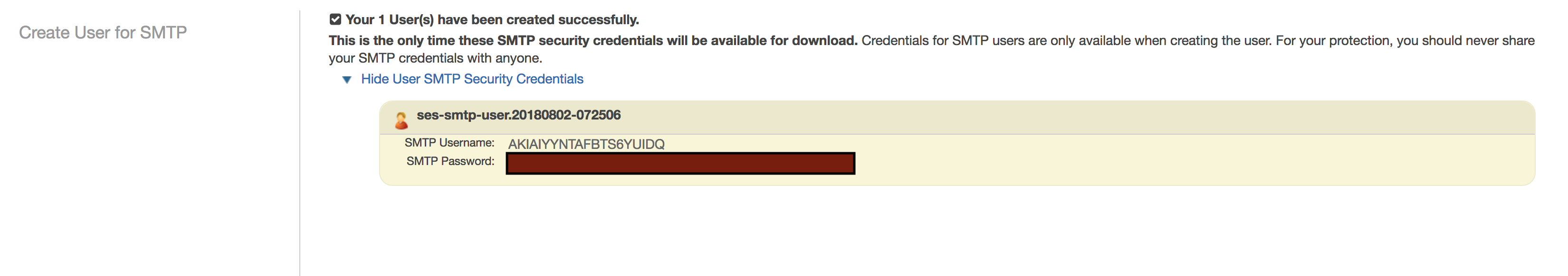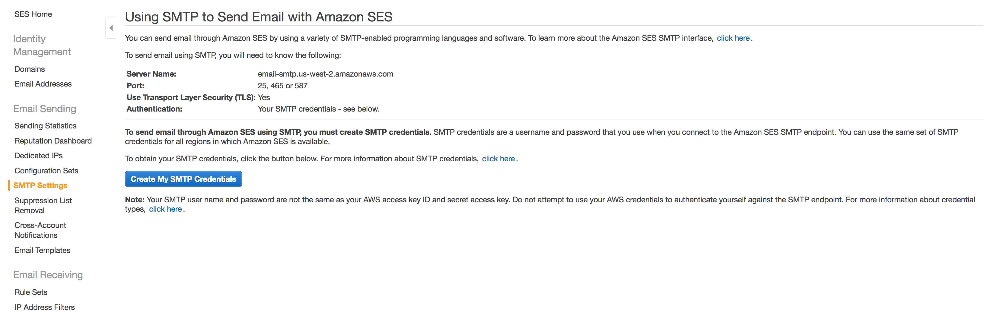 Setup SMTP goto Services -> Customer Engagement -> Simple Email Service -> SMTP Settings create my smtp credential